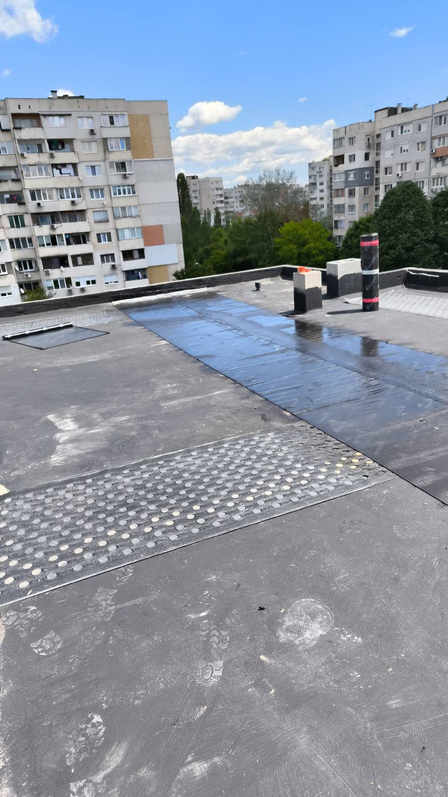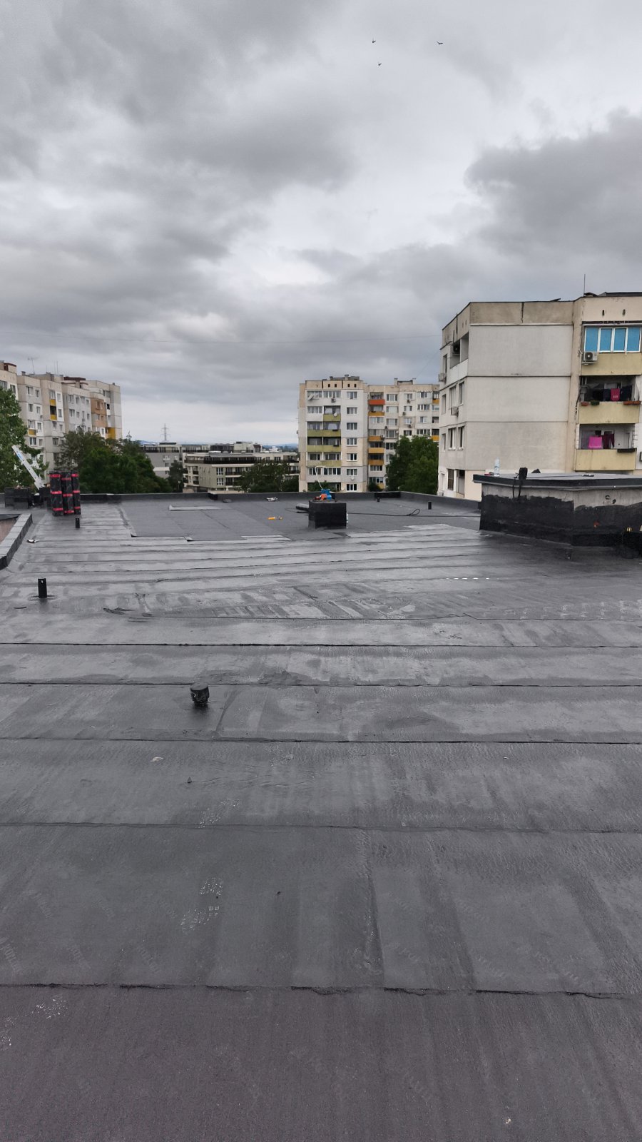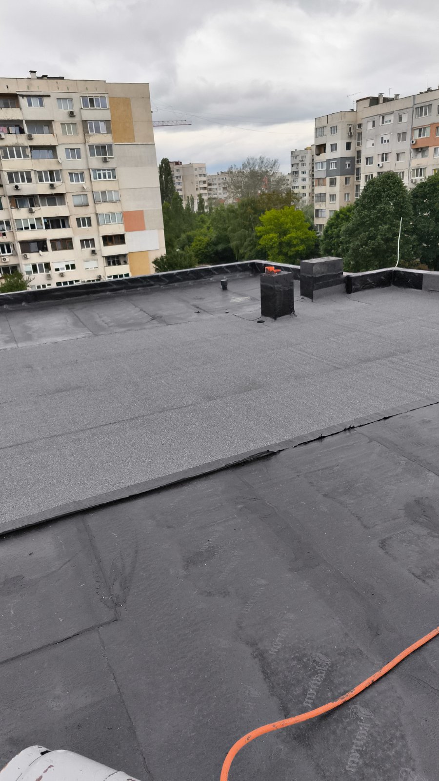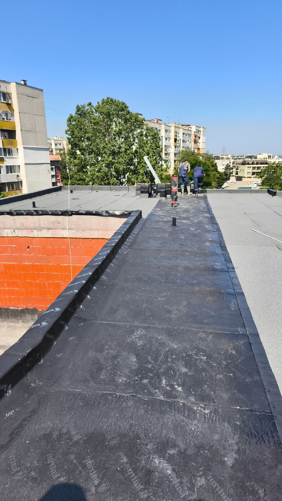Доставка и полагане на битумна хидроизолация с SBS мембрана на нова сграда в гр. София: Екипът на Hydrostop.bg успешно изпълни проект за монтаж на SBS битумна хидроизолационна система Katran върху новопостроена сграда в квартал Обеля, гр. София. Системата включва двупластова битумна мембрана с пародренаж, осигуряваща надеждна защита от влага и удължен експлоатационен живот на покривната конструкция.