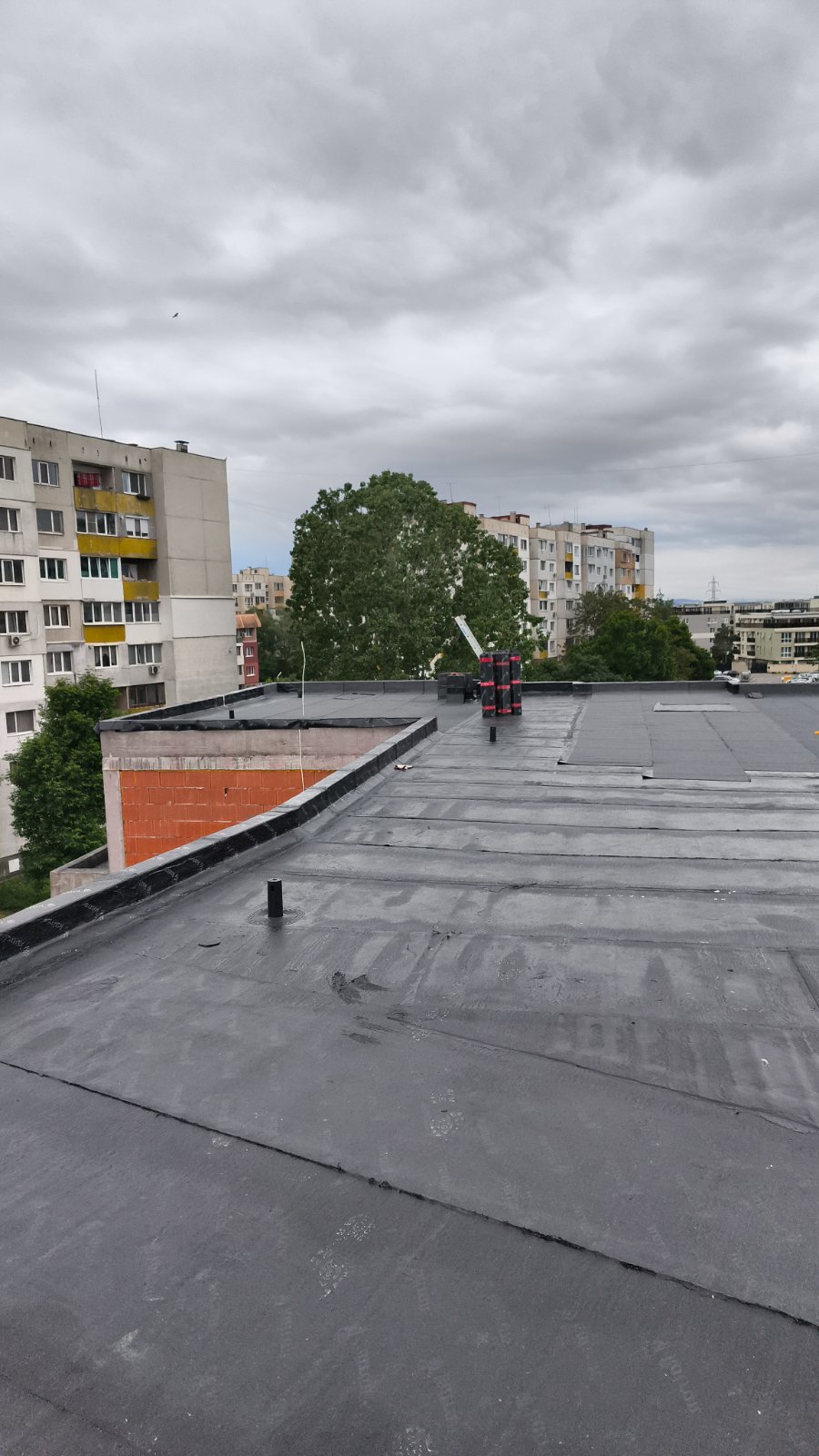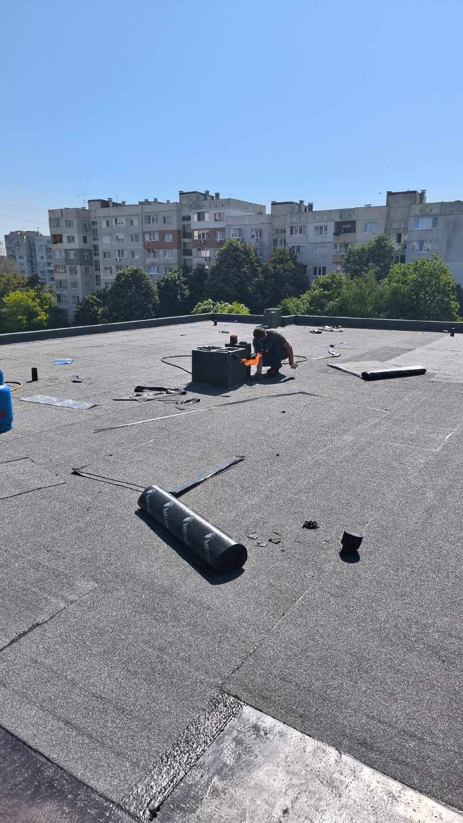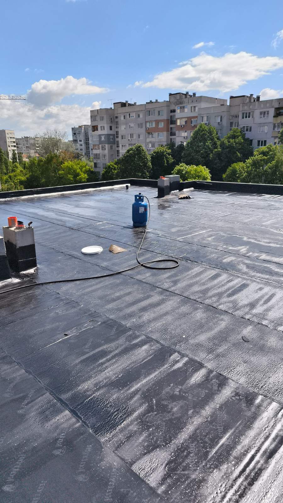 Доставка и полагане на битумна хидроизолация с SBS мембрана на нова сграда в гр. София: Екипът на Hydrostop.bg успешно изпълни проект за монтаж на SBS битумна хидроизолационна система Katran върху новопостроена сграда в квартал Обеля, гр. София. Системата включва двупластова битумна мембрана с пародренаж, осигуряваща надеждна защита от влага и удължен експлоатационен живот на покривната конструкция.