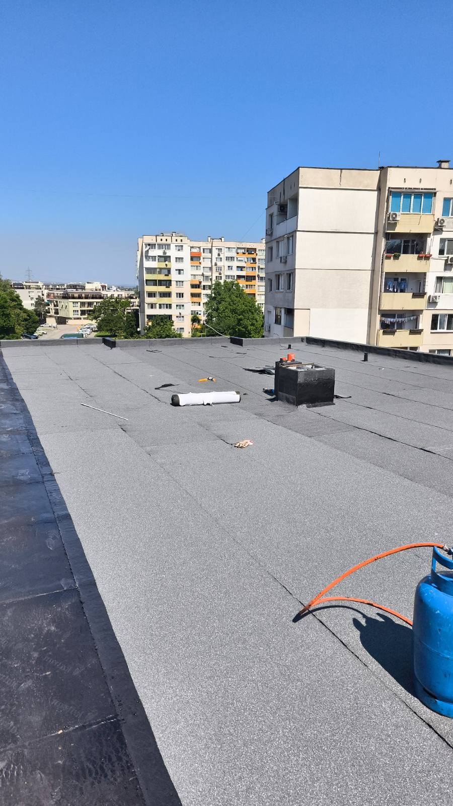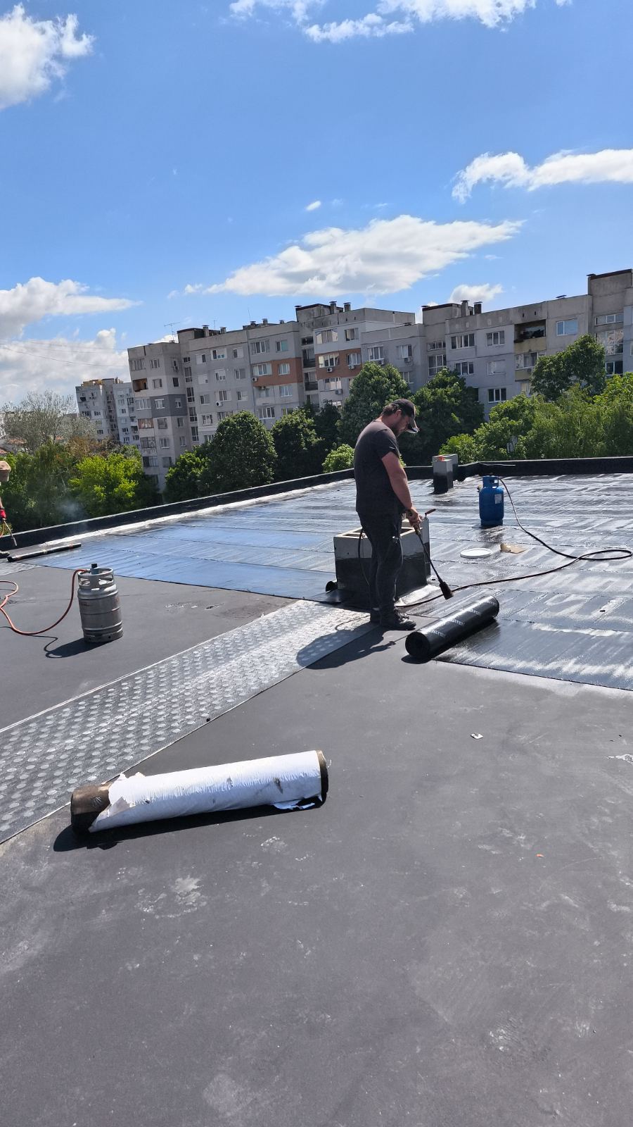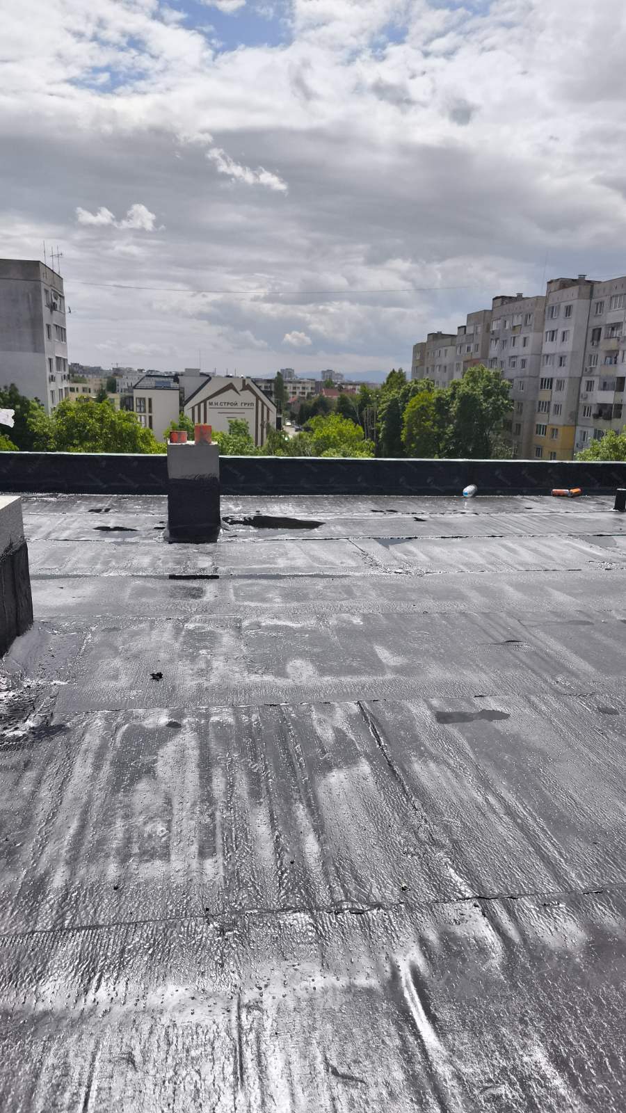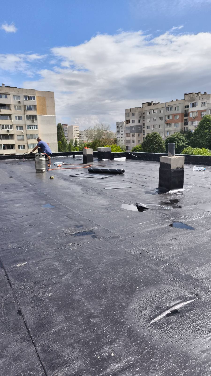 Доставка и полагане на битумна хидроизолация с SBS мембрана на нова сграда в гр. София: Екипът на Hydrostop.bg успешно изпълни проект за монтаж на SBS битумна хидроизолационна система Katran върху новопостроена сграда в квартал Обеля, гр. София. Системата включва двупластова битумна мембрана с пародренаж, осигуряваща надеждна защита от влага и удължен експлоатационен живот на покривната конструкция.