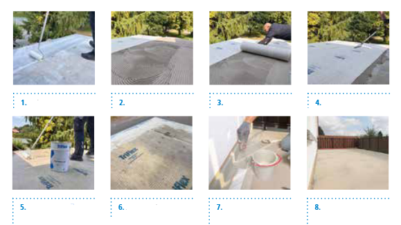 1. Подгответе субстрата, минералните субстрати също се обработват с грунд Triflex ProDrain Primer. 2. Лепилото Triflex ProDrain Fix+ се нанася на два слоя... 3. ... и след това се разточва разделителната мембрана Triflex DC-Mat. 4. Листът се залепва по цялата повърхност с помощта на притискаща ролка. 5. Цялостното грундиране с Triflex Cryl Primer 276 придава твърдост на разделителната мембрана. 6. За обезвъздушаване над лицевия ръб, корнизните облицовки се нанасят с Triflex Cryl Filler. 7. Връзките и детайлите на стените са уплътнени с Triflex ProDetail. 8. Накрая може да се приложи уплътнителната система Triflex BTS-P.